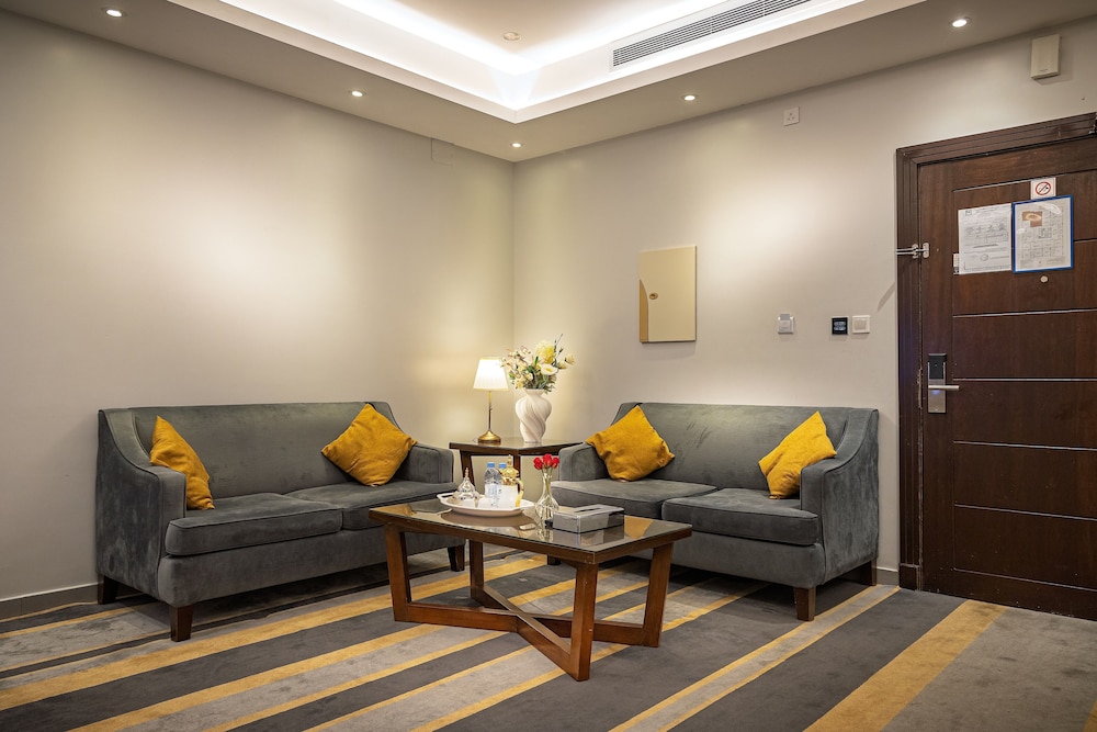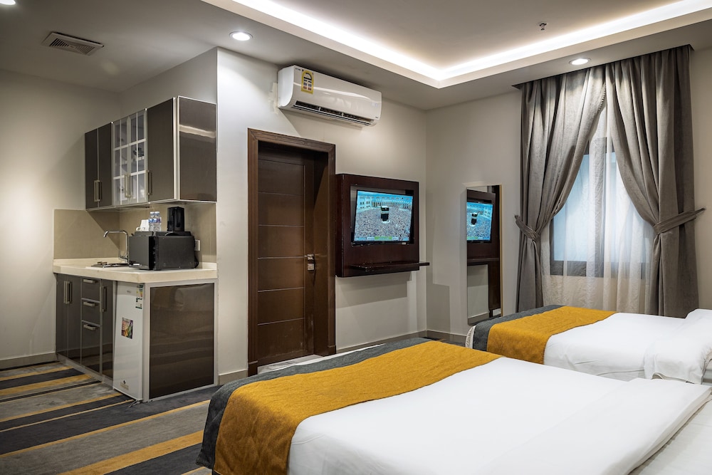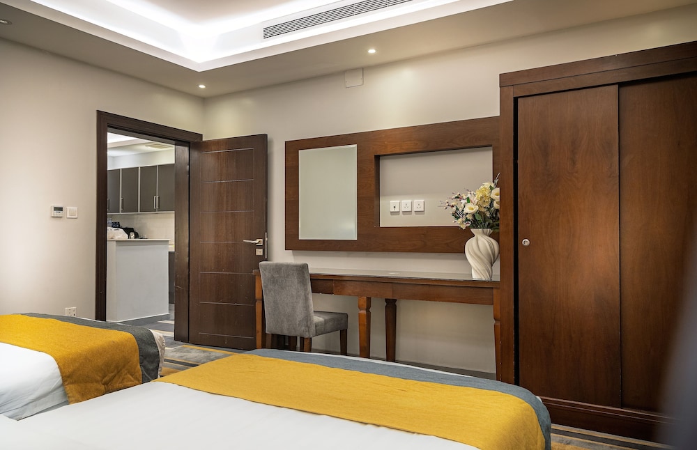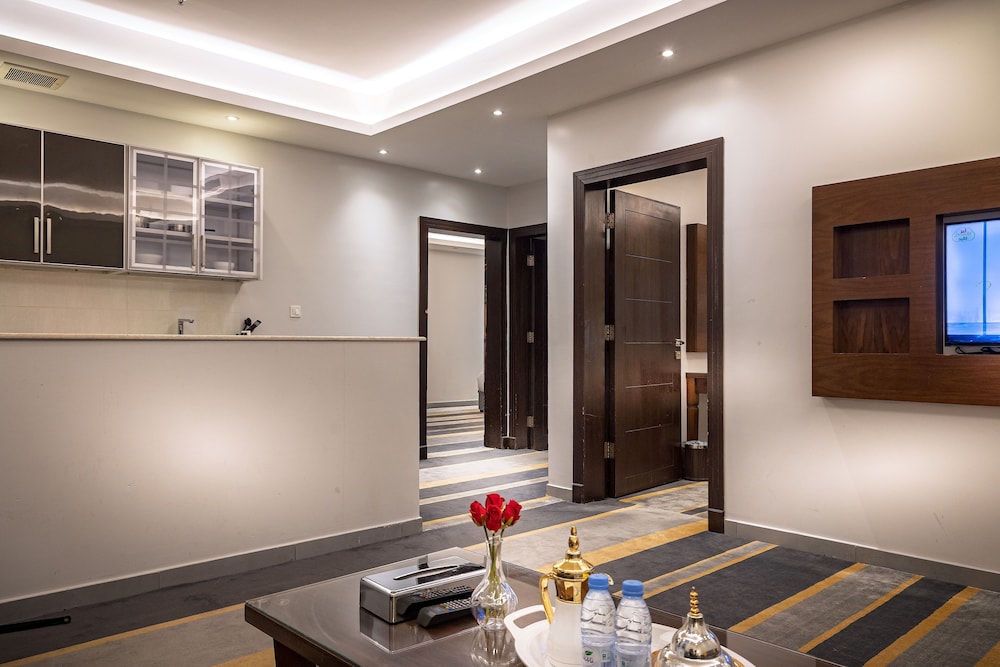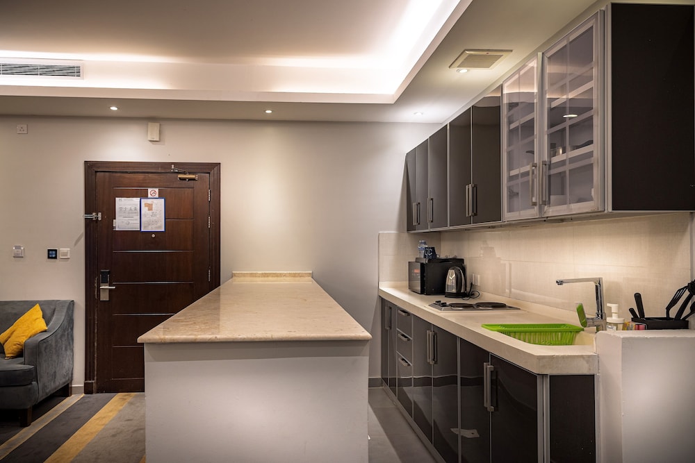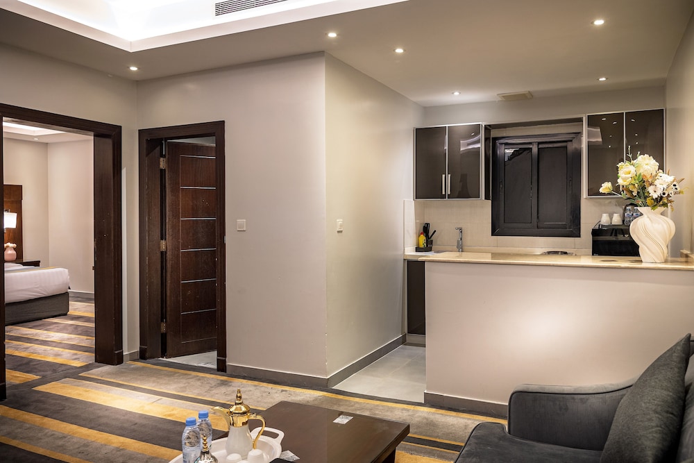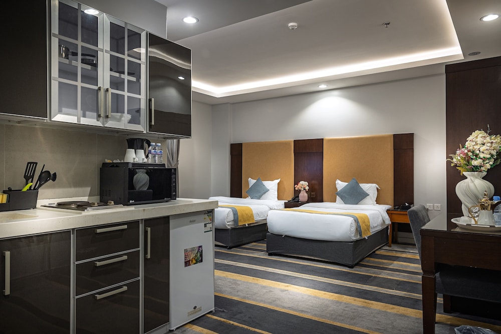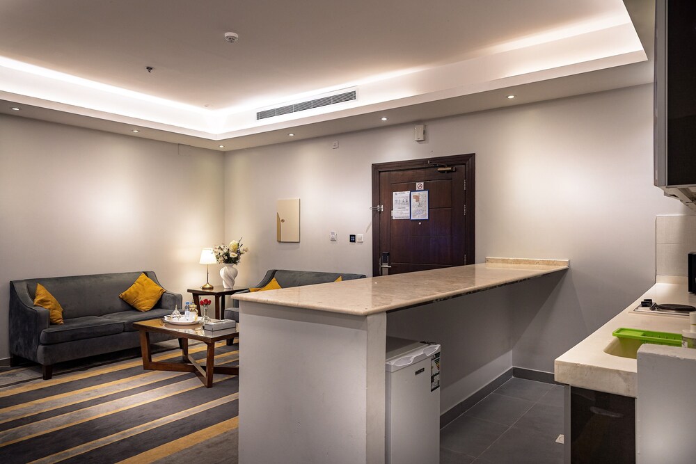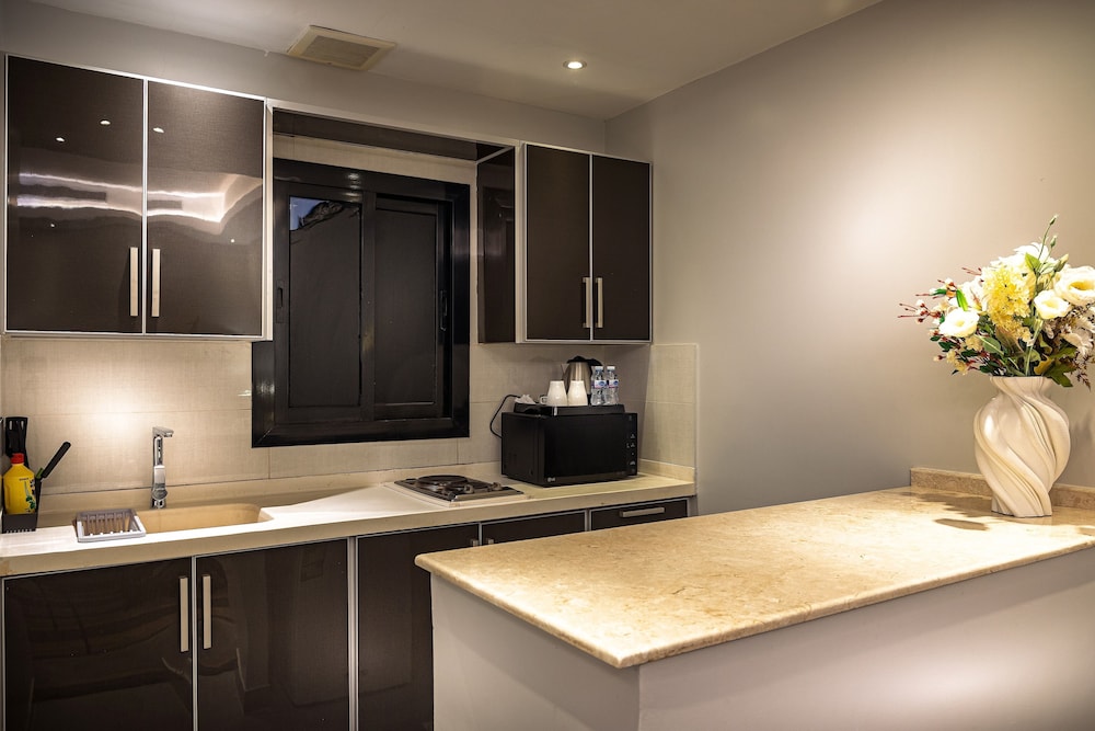 Dar Wed Serviced Apartments in Dschidda (An Nuzhah) ist nur 15 Minuten Fahrt von Red Sea Mall und Jeddah Corniche entfernt. Dieses Aparthotel im luxuriösen Stil ist 10,2 km von Rotes Meer und 1,7 km von Jeddah International Exhibition & Convention Centre entfernt. Fühl dich in einem der 43 klimatisierten Zimmer, die Küchen bieten, die über Kühlschränke und Öfen verfügen, wie zu Hause. In deinem Zimmer findest du ein Memory-Foam-Bett mit hochwertige Bettwaren vor. 4 cm groáe LCD-Fernseher mit Kabelempfang sorgen fr gute Unterhaltung; auáerdem steht ein WLAN-Internetzugang (kostenlos) zur Verfgung. Zur Austattung gehören Safes und Mikrowellen; die Zimmer werden auf Anfrage sauber gemacht. Entfernungen werden bis auf 0,1 Kilometer gerundet.
