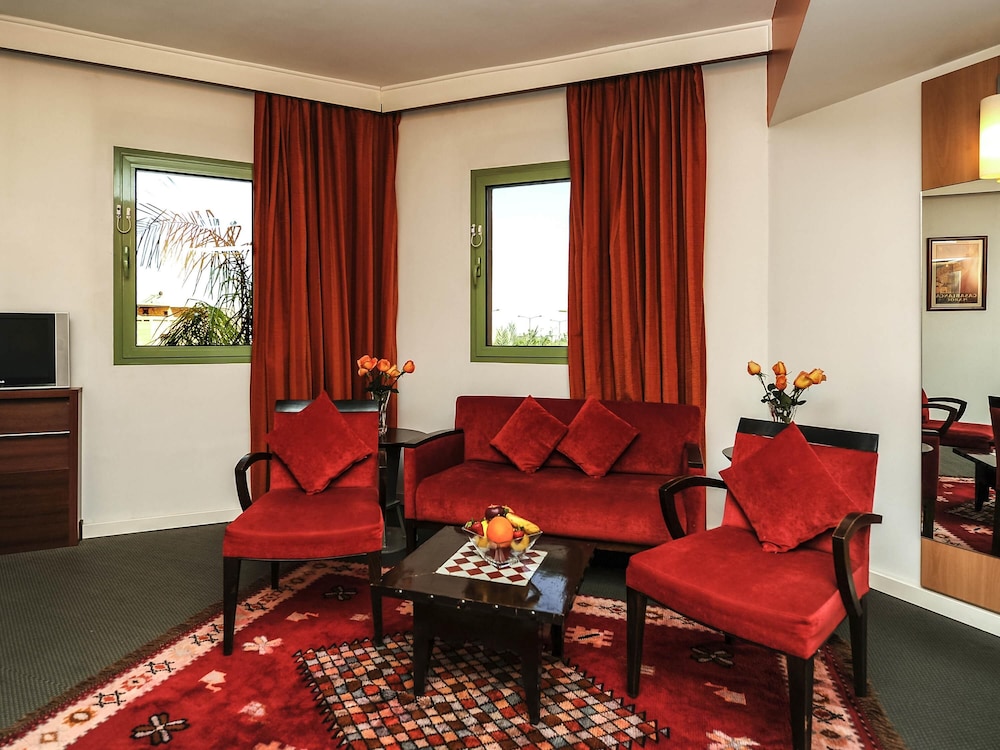 Zum Angebot gehören ein rund um die Uhr geöffnetes Businesscenter, kostenlose Zeitungen in der Lobby und ein Textilreinigungsservice. Wenn du eine Veranstaltung in Marrakesch planst, ist dieses Hotel eine gute Wahl, denn zu den 441 Quadratfuß (41 Quadratmeter) großen Veranstaltungsräumlichkeiten zählen Konferenzfläche und ein Tagungsraum. Vor Ort gibt es Folgendes: Parken ohne Service (kostenlos). Nutz folgende Freizeiteinrichtung: Außenpool. Du kannst aber auch den schönen Ausblick von folgenden Punkten genießen: Terrasse und Garten. Dieses Hotel bietet auch kostenloses WLAN, ein Concierge-Service und ein Spielzimmer/Arcade-Spiele. Nahe gelegene Attraktionen zu erreichen ist dank des Shuttles (gegen Gebühr) ein Kinderspiel. Lass den Tag bei einem Drink an der Bar/Lounge oder Poolbar ausklingen. Gegen Gebühr wird täglich von 06:30 Uhr bis 10:30 Uhr ein Frühstücksbuffet angeboten.Du wirst gebeten, die folgenden Gebühren direkt in der Unterkunft zu zahlen. Gebühren beinhalten möglicherweise geltende Steuern:
