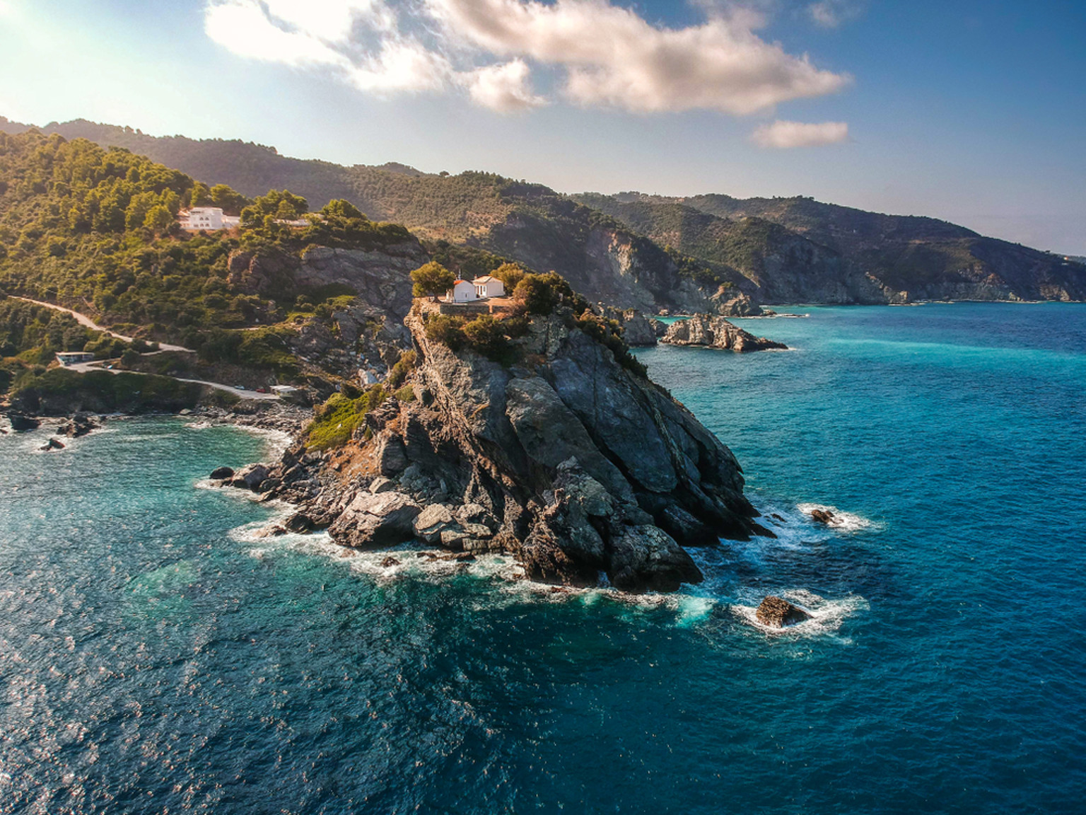 Agios Ioannis-Kapelle: Diese ikonische Kapelle auf einem Felsen wurde durch ihre Rolle im Film „Mamma Mia!“ berühmt. Die Aussicht von hier oben ist spektakulär.