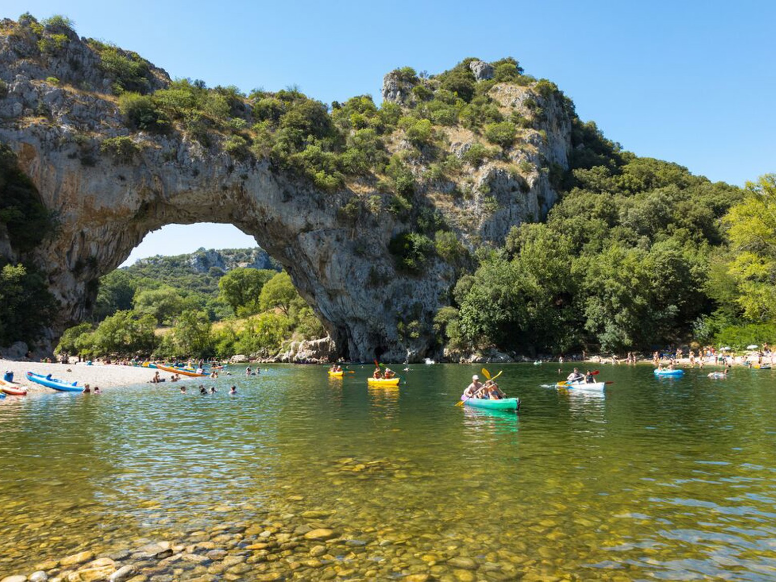 Mitten in Ardèche fließt der Fluss Ardèche selbst, der sich durch Kalksteinfelsen schneidet und das weltberühmte Ardèche-Tal formt. Eine Reise entlang dieses naturgeschaffenen Korridors ist wie eine Reise durch die Zeit und das Kunstmuseum der Naturgewalten. Kanubegeisterte nutzen die kristallklaren Gewässer, die zu aufregenden Abenteuern und atemberaubenden Panoramablicken einladen, die fast unwirklich erscheinen.